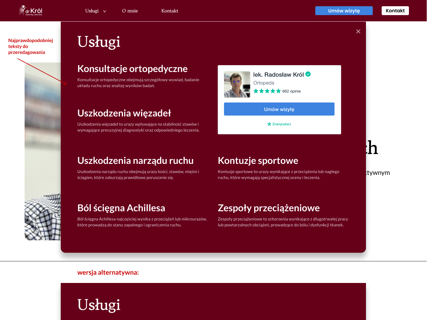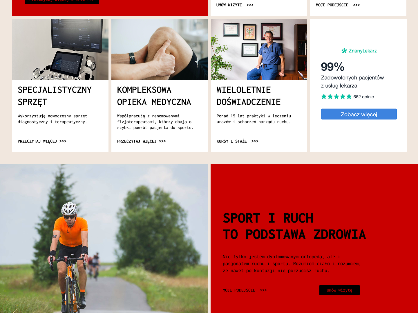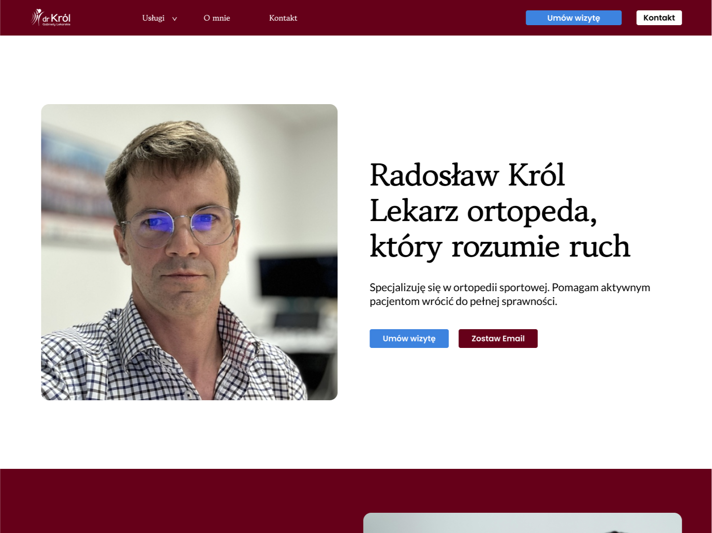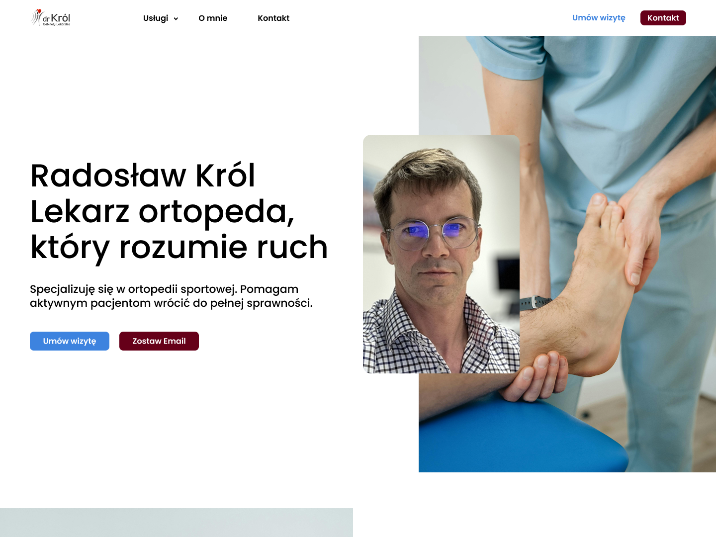 Ta część to pierwsze wrażenie, tu od razu widać czyja to strona, czego dotyczy i jest tu główna interakcja – umówienie wizyty lub zostawienie adresu email.