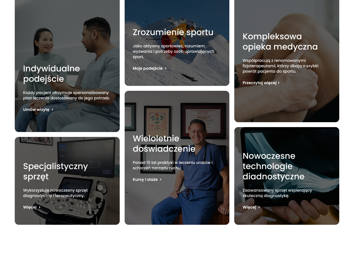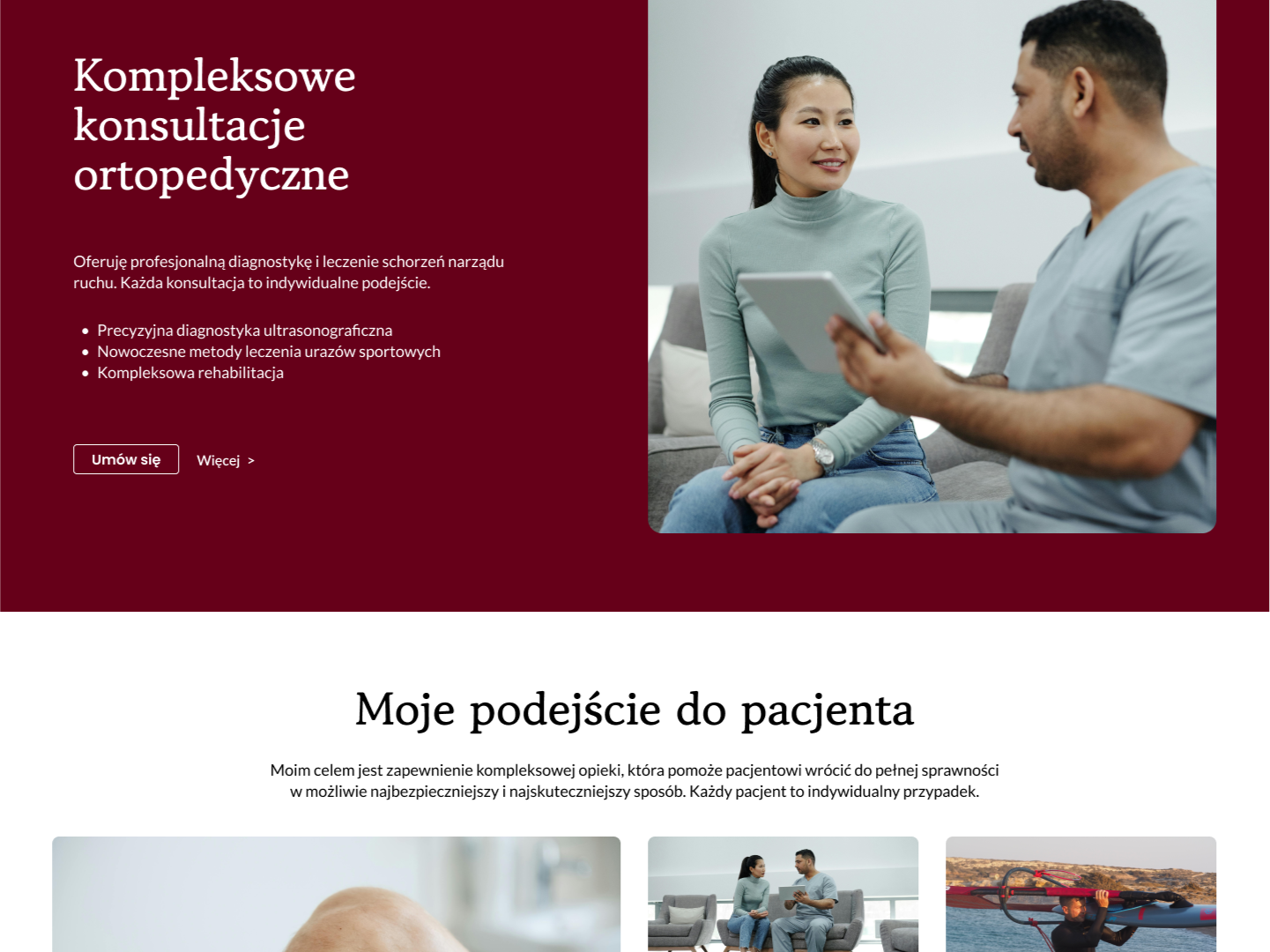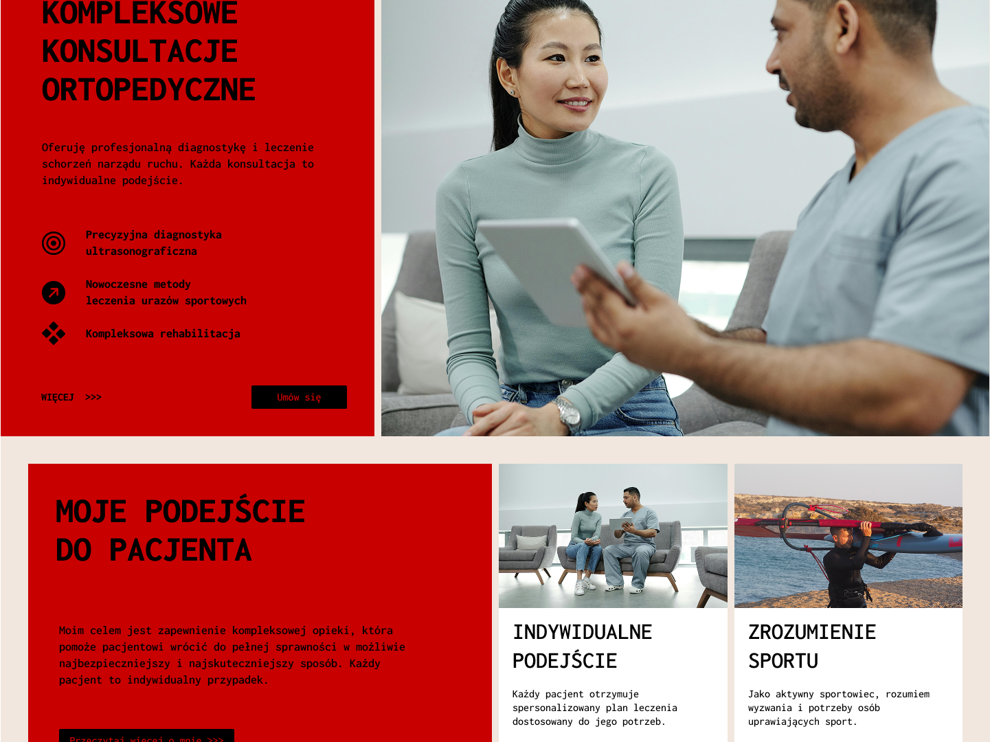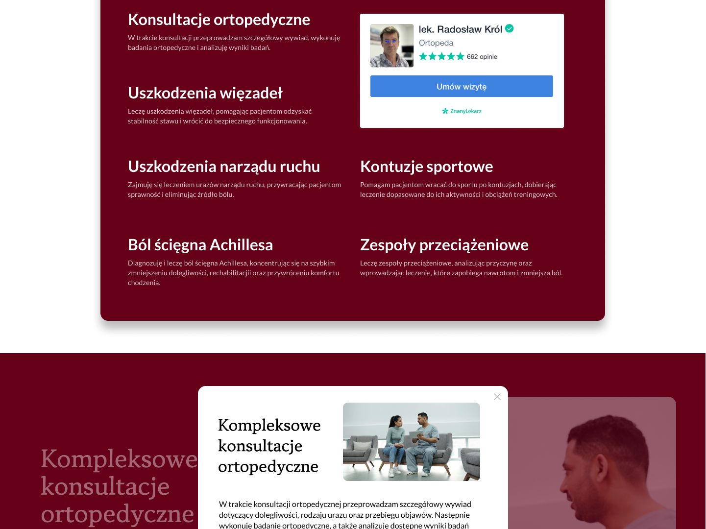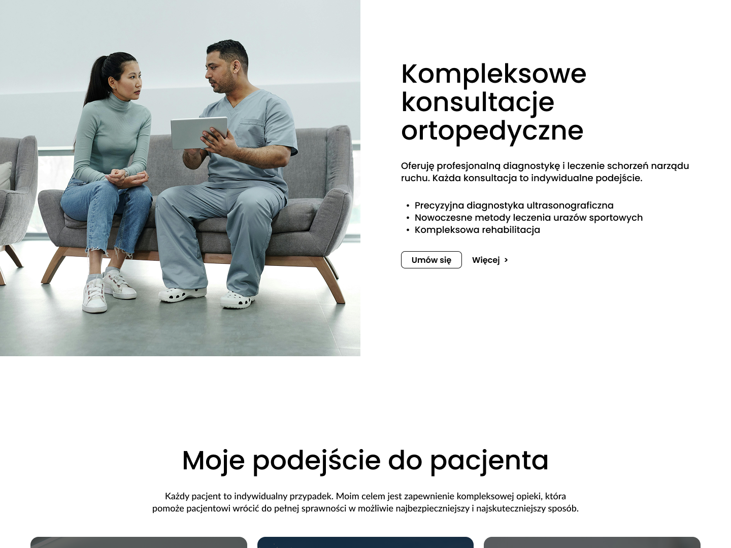 Ta część to pierwsze wrażenie, tu od razu widać czyja to strona, czego dotyczy i jest tu główna interakcja – umówienie wizyty lub zostawienie adresu email.