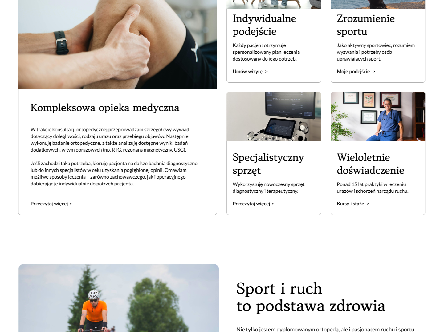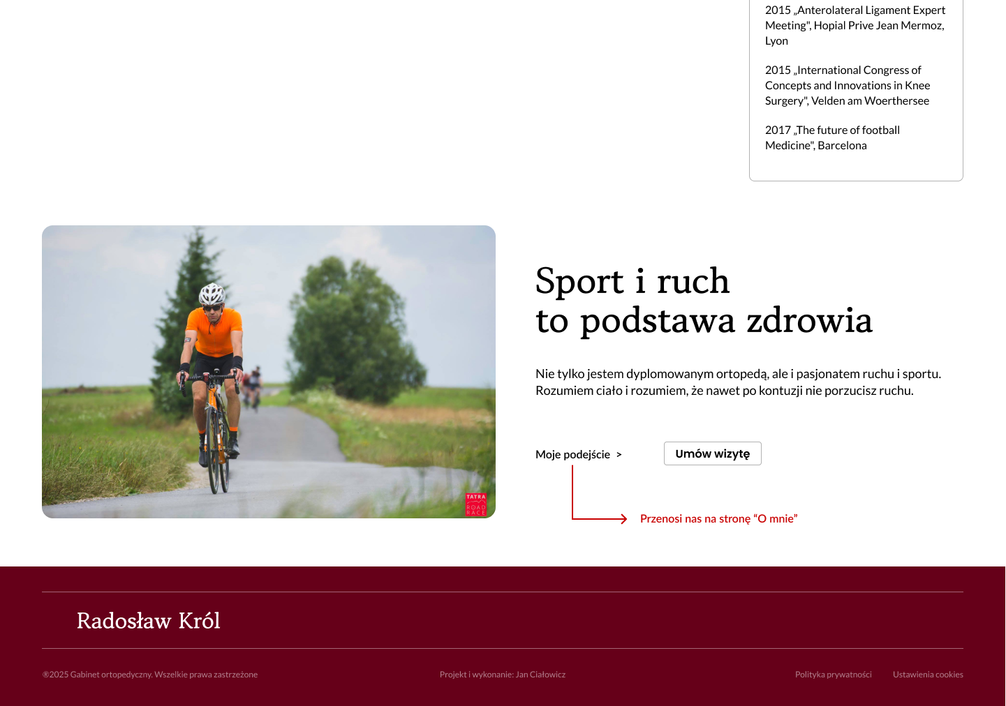 Krótki fragment ze strony „O mnie”, gdzie możemy zobaczyć, że jesteś sportowcem, że masz energię, masz zajawkę i jak to pozytywnie wpływa na twoją pracę i zrozumienie sportu oraz ruchu.